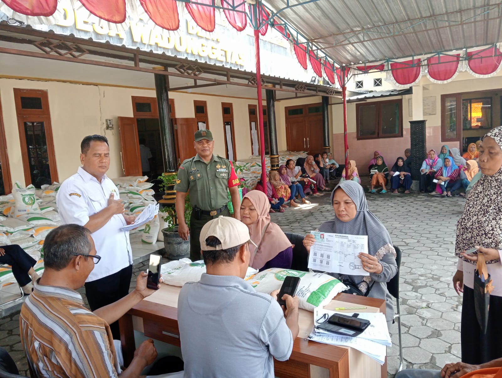 KLATEN| Wartapro.id– Sertu Amar Babinsa Wadunggetas Koramil 22 Wonosari Kodim 0723 Klaten bersama Aiptu Didik H Bhabinkamtibmas Desa Wadunggetas melaksanakan pendampingan penyaluran sembako berupa beras dari Dinas Pangan Tahap 1 TH 2024 Di Kantor Desa Wadunggetas, Kecamatan Wonosari, Kabupaten Klaten, Jawa Tengah, Selasa (6/2/2024).