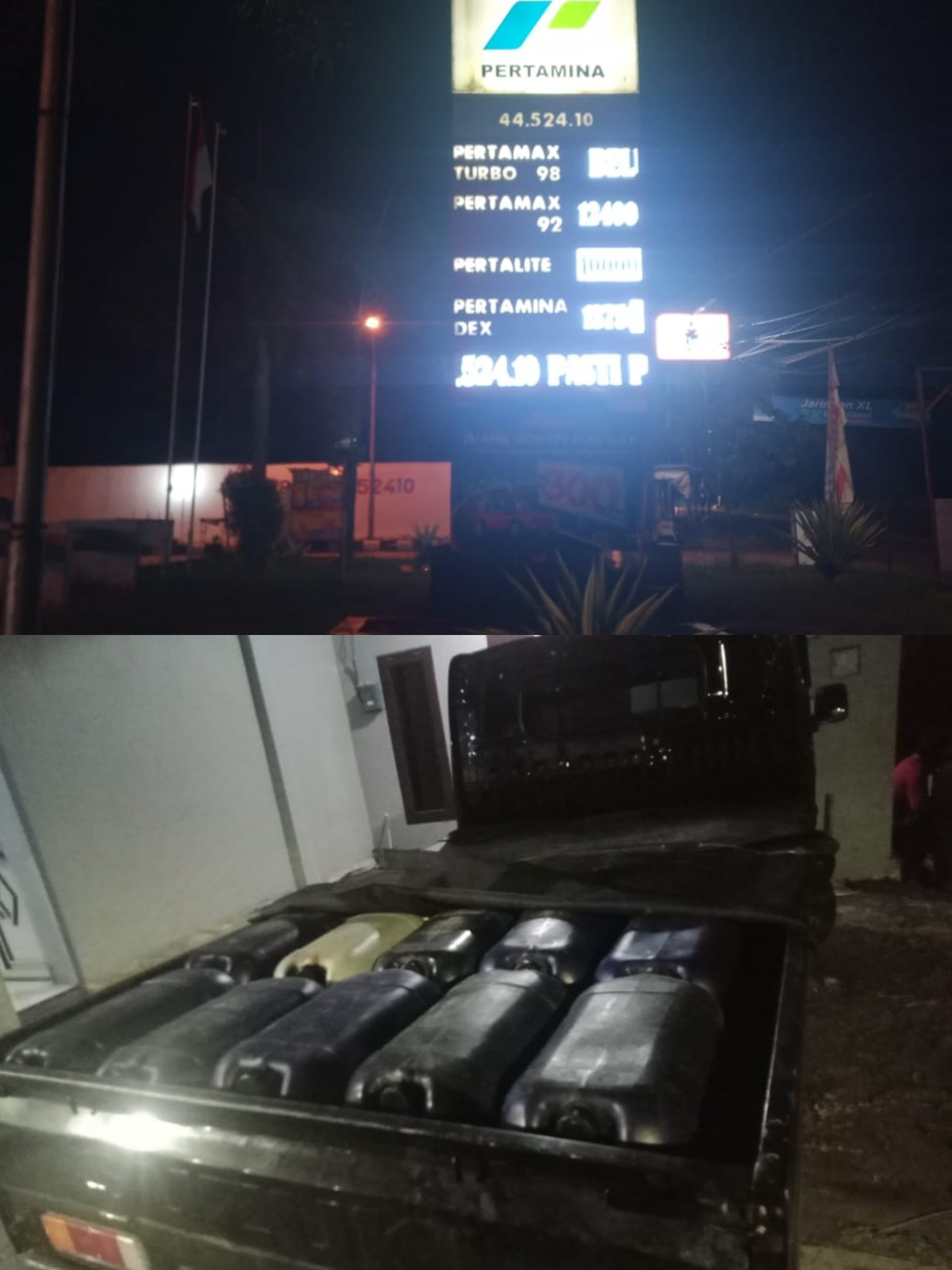 Mobil tersebut bolak-balik mengisi Pertalite di SPBU dan membawa 16 jerigen berisi BBM yang ternyata telah dimodifikasi dengan pompa penyedot untuk mempercepat pengisian.