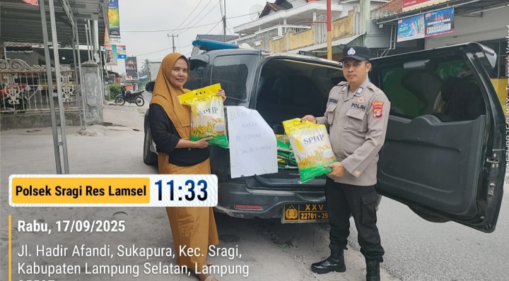 “Hari ini, Personil Polsek Sragi melakukan Patroli Hunting dan penjualan beras Stabilisasi Pasokan dan Harga Pangan (SPHP) dalam rangka Gerakan Pangan Murah di depan Pasar Belangah Desa Sukapura Kecamatan Sragi Kabupaten Lampung Selatan,” ucapnya.