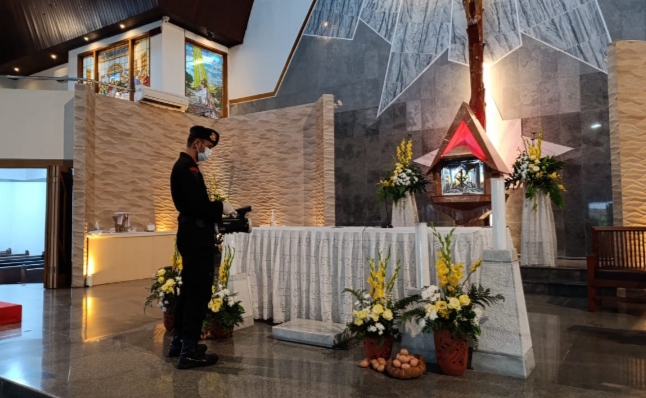 “Sterilisasi dilakukan sebagai langkah preventif untuk memastikan gereja-gereja dalam kondisi aman sebelum digunakan untuk ibadah umat,” kata Kombes Yuni.