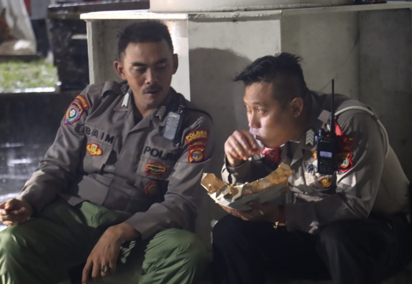 Dalam tugas mereka yang penuh tantangan, terutama dalam menjaga keamanan dan kenyamanan pelabuhan yang sibuk, kedua polisi ini memilih untuk menikmati waktu istirahat sejenak.