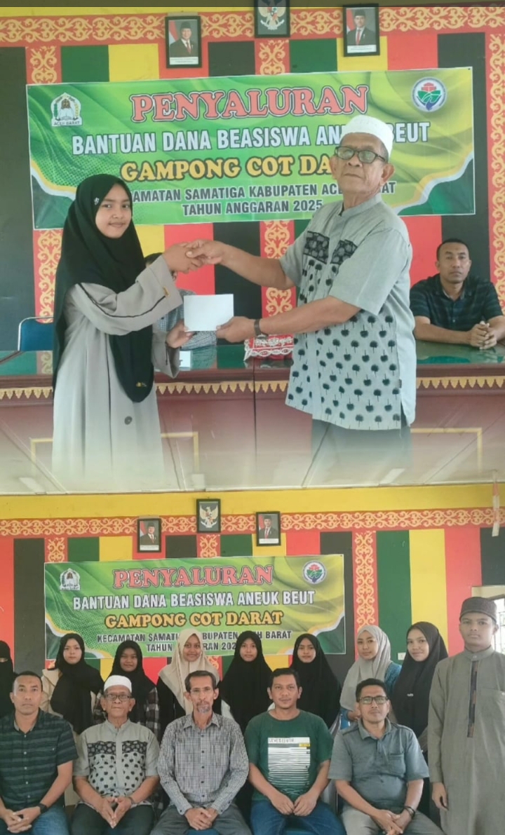 Pemberian bantuan beasiswa untuk Aneuk Beut Tahun anggaran 2025 ini dikhususkan kepada anak-anak Gampong Cot Darat yang menimba ilmu agama di Dayah/pesantren baik itu di dalam Kabupaten Aceh Barat maupun diluar Aceh Barat. Keuchik Gampong Cot Darat H.Zulkarnain, S.Pd dalam sambutannya mengatakan penyerahan bantuan beasiswa ini sesuai dengan Visi Misi Keuchik yang telah tertuang dalam RPJMG.  “Untuk Tahun 2025 ini kita alokasikan sebanyak 12 orang penerima, masing-masing penerima mendapatkan 1 juta untuk usia SMA dan 750 ribu untuk usia SMP, Semoga dengan adanya bantuan beasiswa ini anak-anak kami bisa lebih bersemangat dalam menuntut ilmu agama di Dayah/pesantren”. Ujarnya.