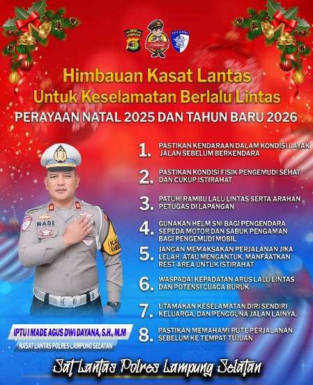 Kasat Lantas Polres Lampung Selatan, IPTU I Made Agus Dwi Dayana, mengatakan bahwa kepatuhan masyarakat terhadap imbauan keselamatan menjadi kunci utama dalam menciptakan kelancaran dan keamanan lalu lintas selama libur Natal dan Tahun Baru.