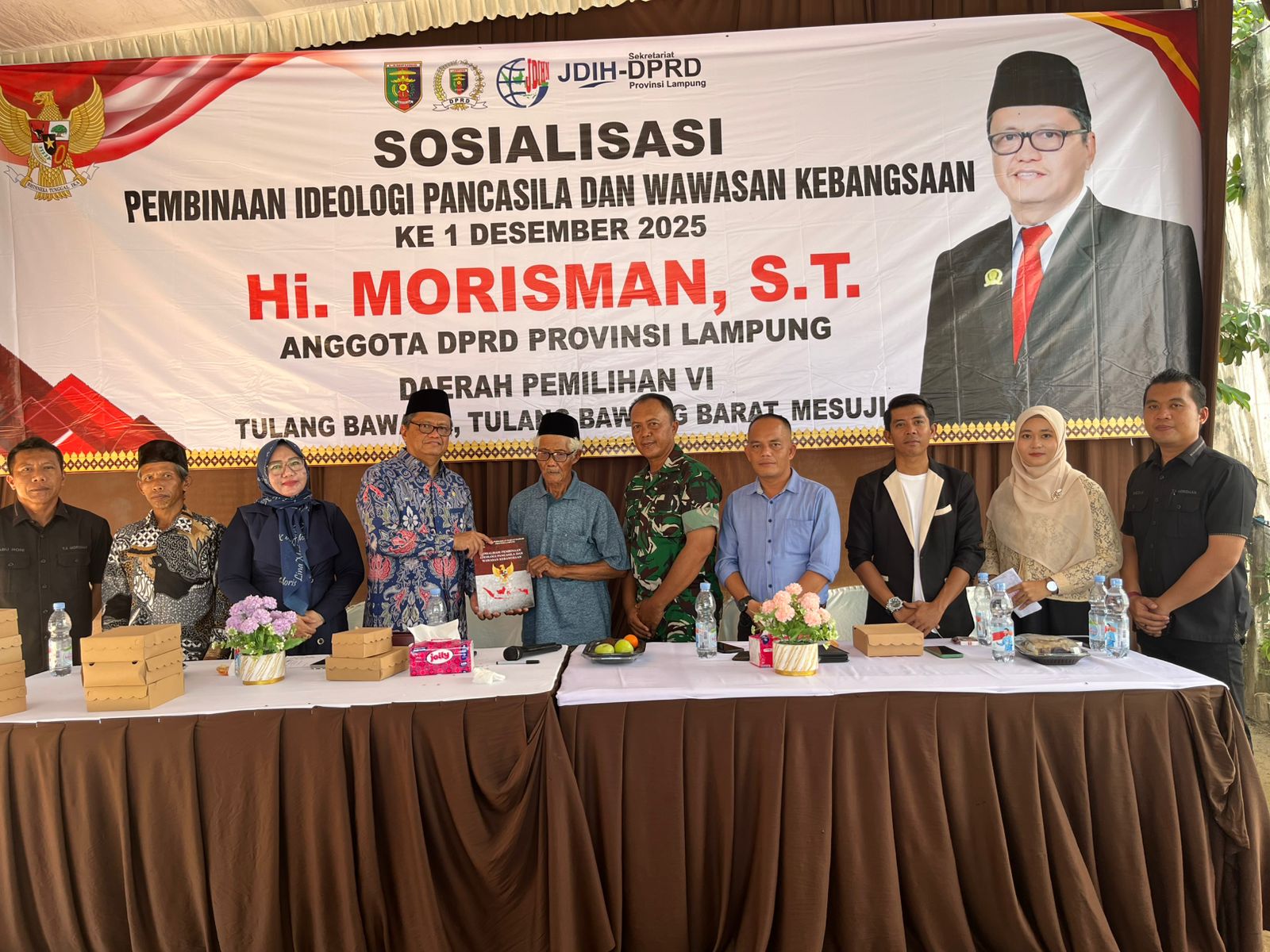 Wartapro.id _ TULANGBAWANG – Anggota DPRD Provinsi Lampung, Morisman ST, menggelar sosialisasi pembinaan ideologi Pancasila dan wawasan Kebangsaan di daerah pemilihan VI Kabupaten Tulangbawang, Tulangbawang Barat, dan Kabupaten Mesuji, mulai 1 Desember sampai 7 Desember 2025.