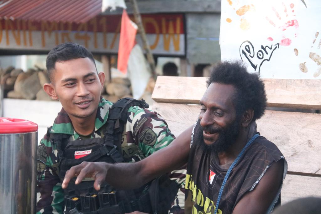Pemandangan yang tentunya langka, prajurit Kostrad duduk santai dengan masyarakat Papua, tanpa adanya batasan dan jarak lagi.Dari foto yang ditangkap oleh mata kamera, Serda Sigit, Serda Hijri, Prada Fero dan personil lainnya terlihat sangat akrab dengan warga.