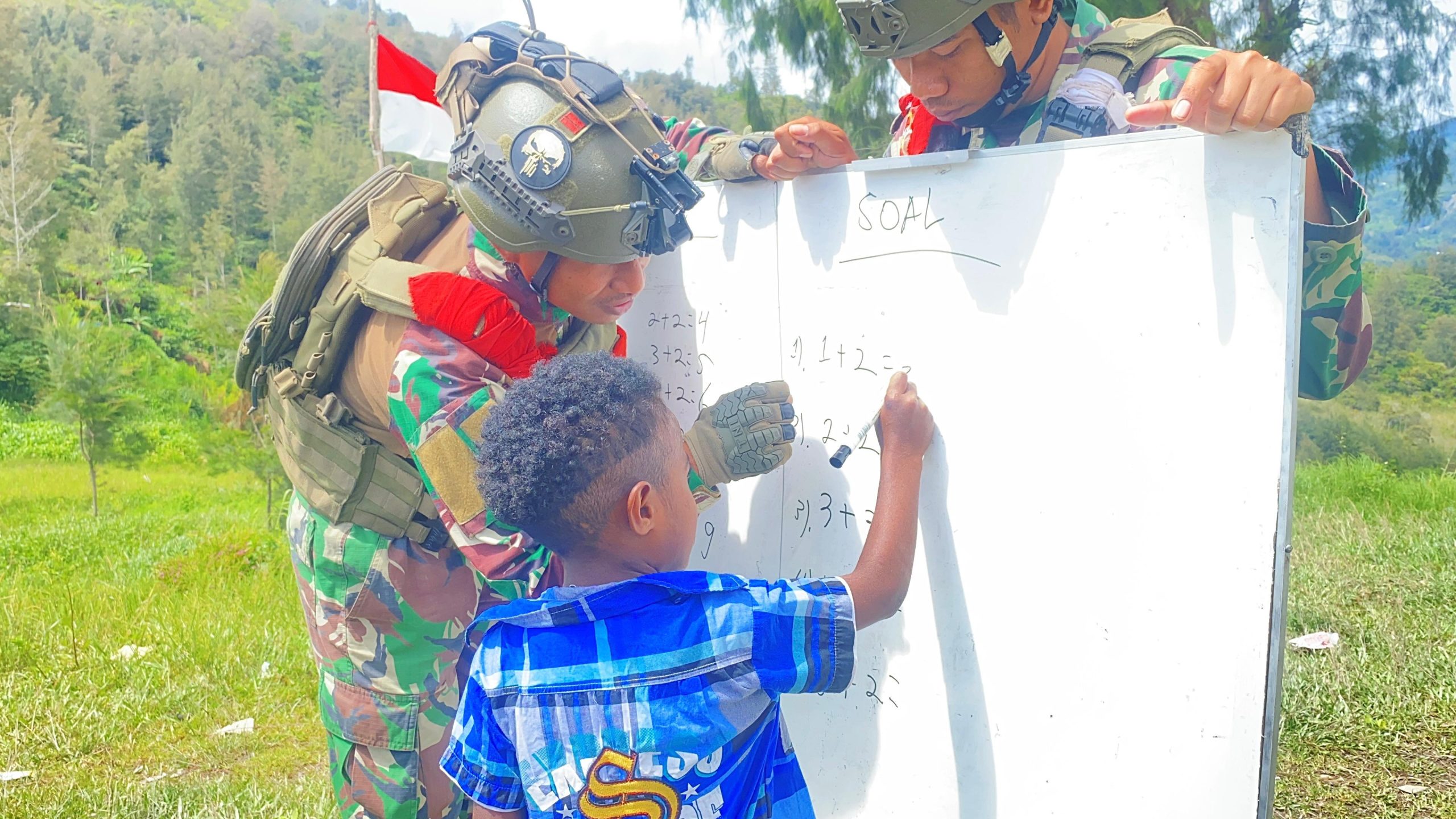 Kegiatan yang dipimpin oleh Sertu Yusran ini, menampilkan suasana belajar yang ceria meskipun berada di tengah tantangan geografis dan terbatasnya fasilitas. Anak-anak dengan penuh semangat mengikuti setiap materi yang diberikan, mulai dari pengenalan huruf, angka, hingga penyusunan kata-kata sederhana dalam Bahasa Indonesia.