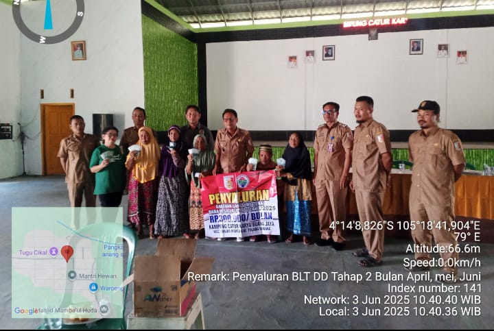 Wartapro.id _ Tulang Bawang – Pemerintah kampung Catur Karya Buana Jaya, Kecamatan Banjar Margo, Kabupaten Tulang Bawang, Provinsi Lampung membagikan bantuan langsung tunai (BLT) kepada 12 keluarga penerima manfaat (KPM). Bantuan BLT yang diberikan kepada warga berasal dari dana Desa (DD) Tahun 2025.