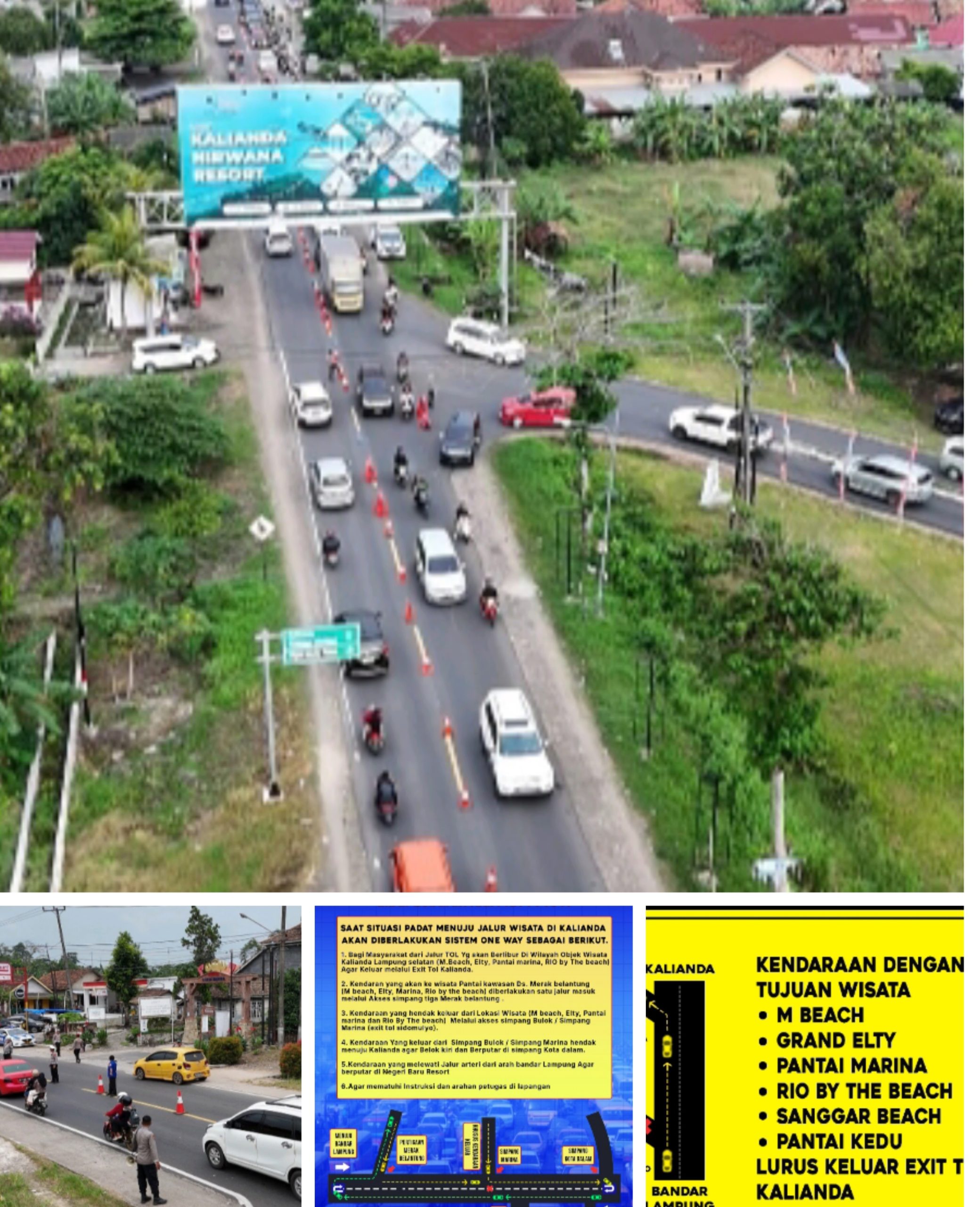 Kasat Lantas Polres Lampung Selatan, AKP R Manggala Agung SM , menjelaskan, “Sistem one way ini diberlakukan mulai dari jalur Tol menuju Objek Wisata Kalianda, termasuk M Beach, Elty, Pantai Marina, dan RIO By The Beach.”