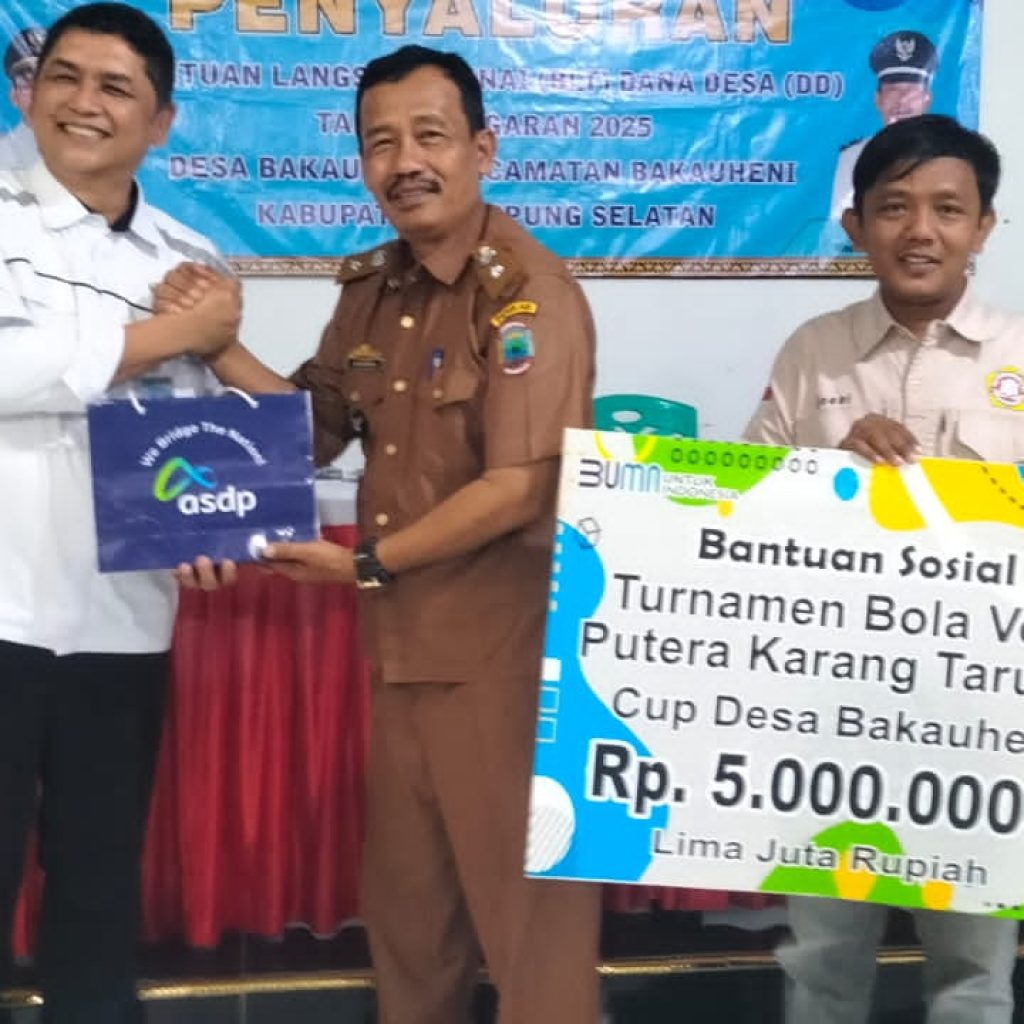 LAMSEL, WARTAPRO.ID – Bentuk support dan dukungan dengan akan di adakan event turnamen volly ball Karang Taruna Cup 1 Desa Bakauheni, PT ASDP Indonesia Ferry (Persero) Cabang Bakauheni Memberikan Bantuan Sosial uang tunai acara di gelar di Kantor Desa Bakauheni Kecamatan Bakauheni Kabupaten Lampung Selatan. Senin, 16 Juni 2025.